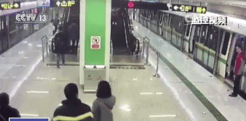 近日,在南宁市新民路地铁站列车关门发车之际,车上突然冲下了两男一女,最后一名男子险些被车门夹到。