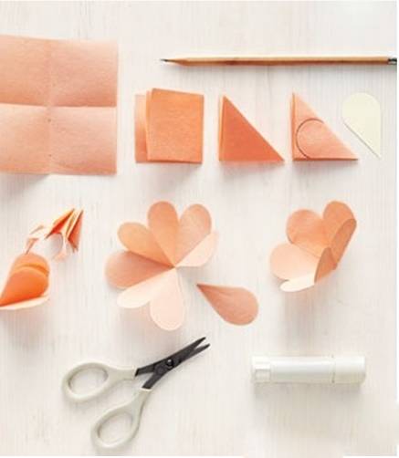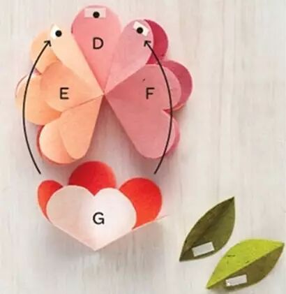 七朵小花瓣分别按图中位置摆放,并在图中黑点的位置贴上双面胶,然后依照图示粘合在一起。